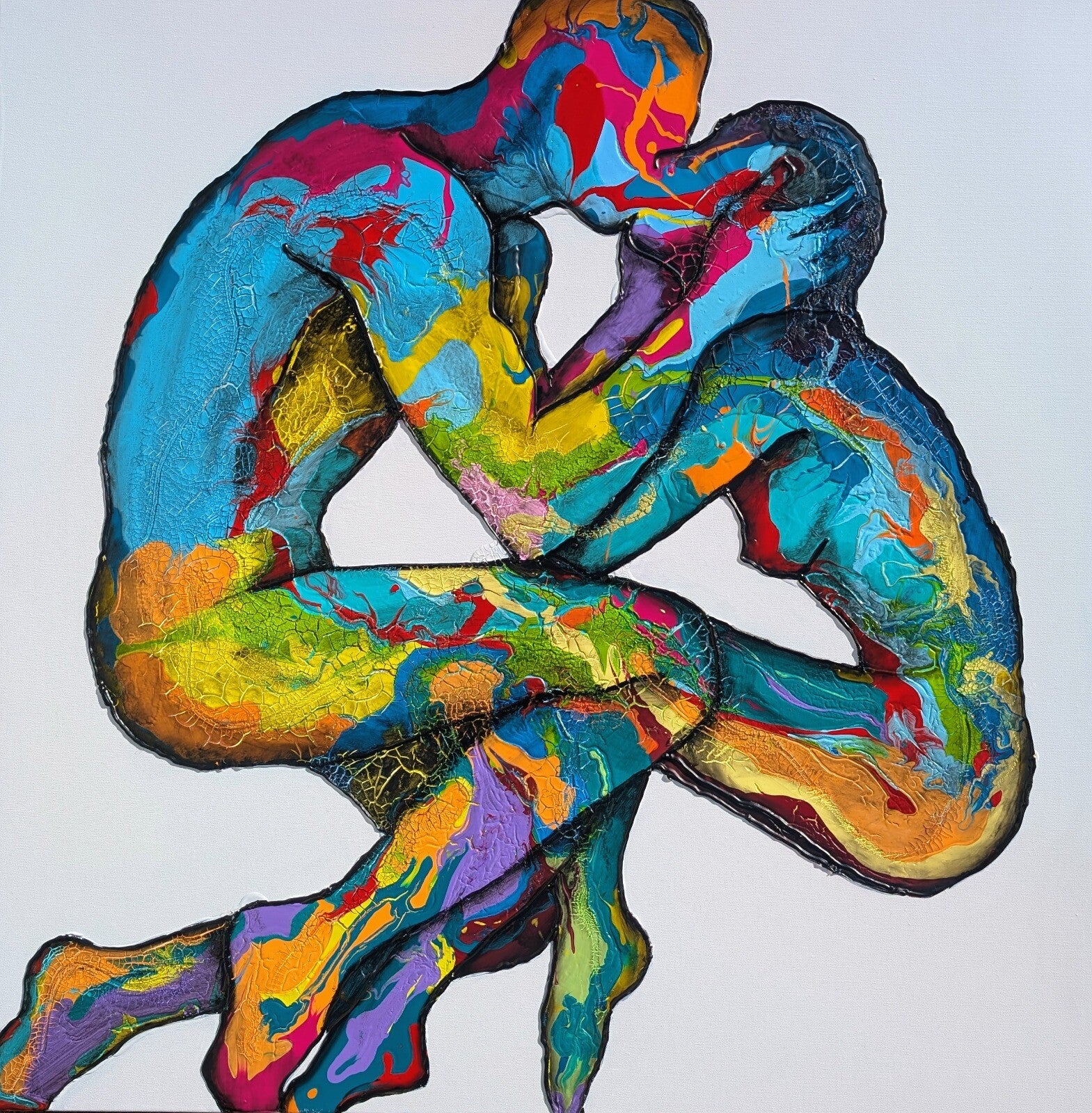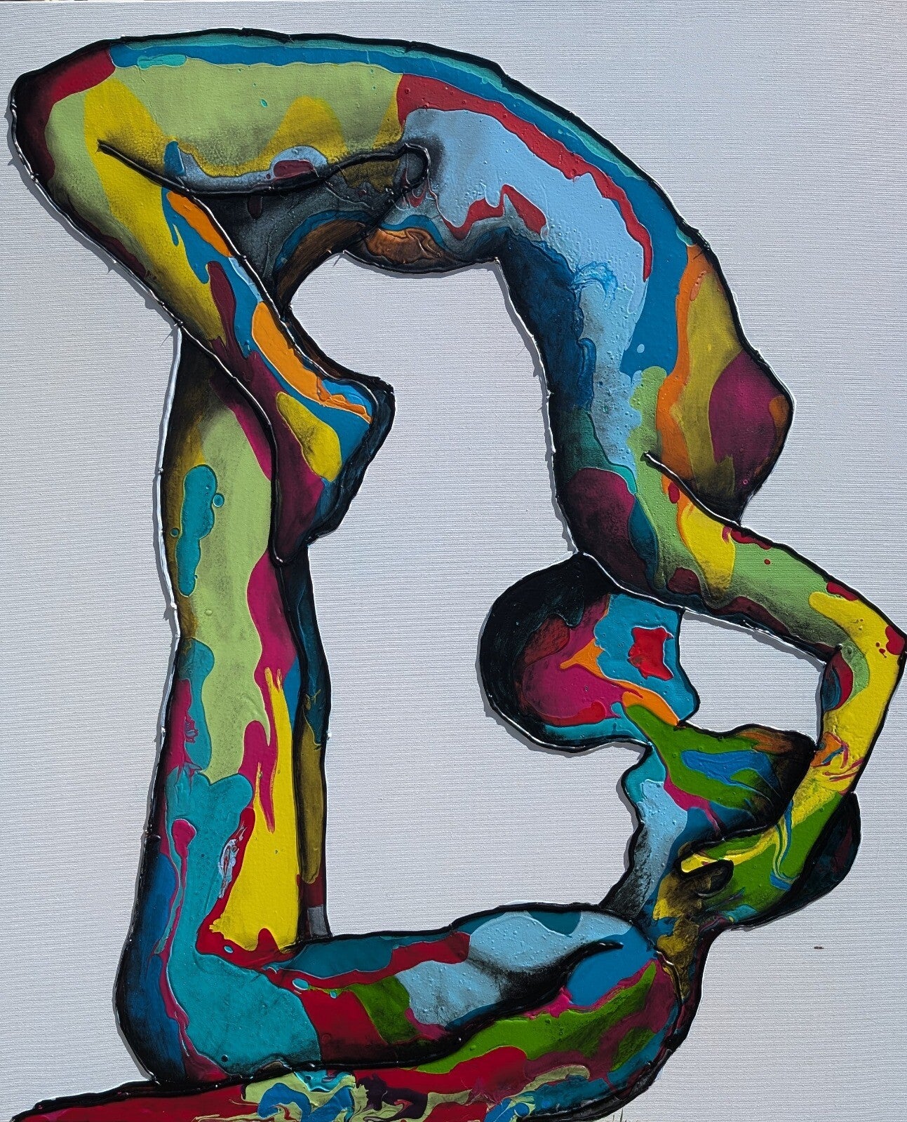 La sua ricerca si muove lungo territori profondamente umani: lo sguardo come racconto, il corpo come mappa emotiva, il confine come luogo attraversabile. Nei lavori di Zavattaro non c’è mai una figura statica, ma una tensione continua tra caduta e rialzarsi, tra perdita ed equilibrio ritrovato. La materia pittorica, costruita attraverso acrilico, collage di colore e hot glue, diventa superficie viva, tattile, attraversata da rilievi che guidano l’occhio e invitano il corpo a partecipare.